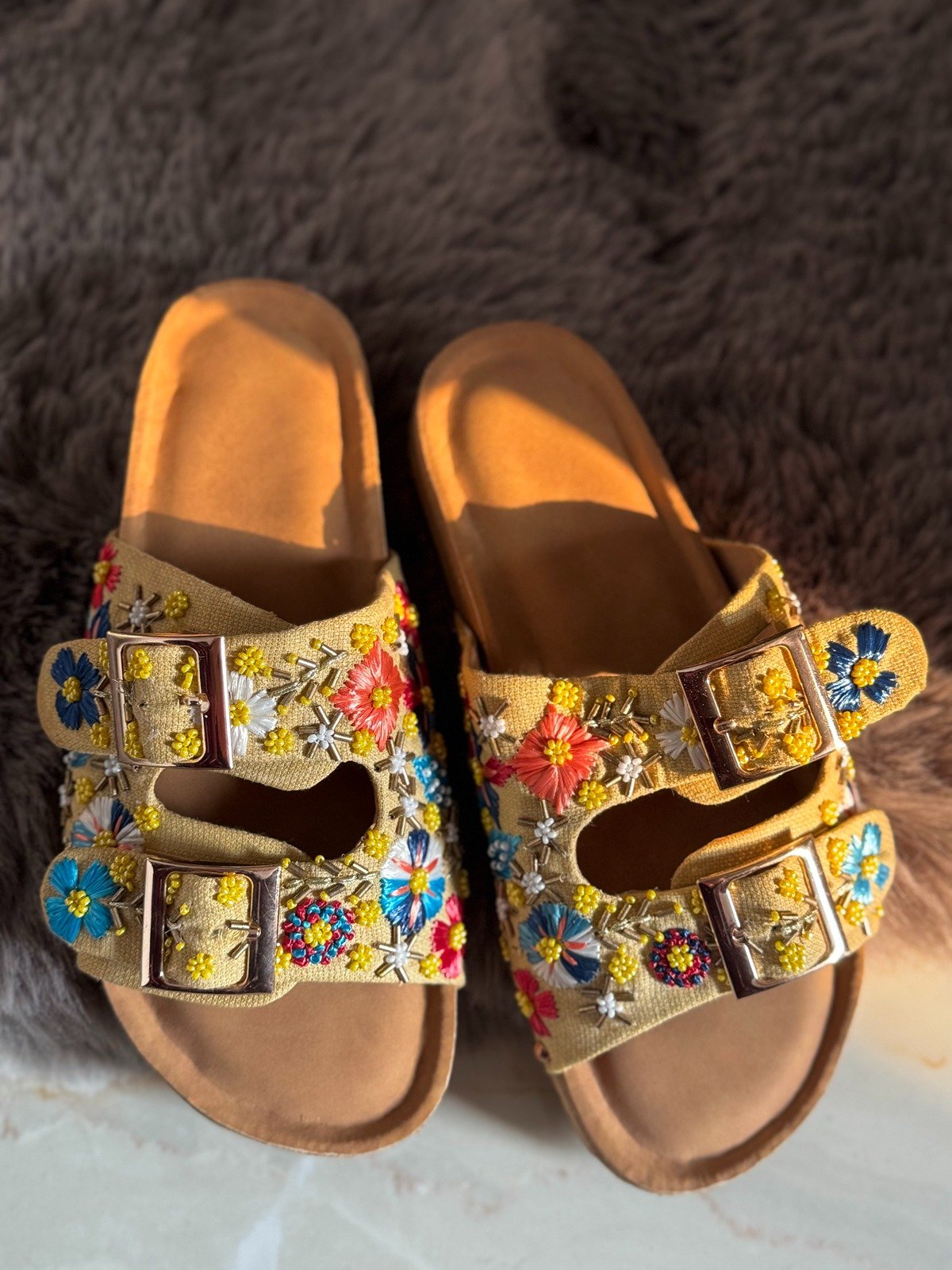 Beige sliders with vibrant hand-embroidered floral detailing and adjustable buckle straps.