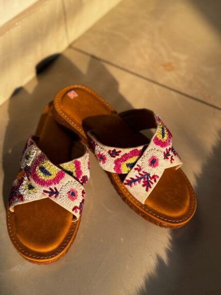 The Gulbahaar Bloom Sliders celebrate artisanal craftsmanship with playful floral embroidery on a warm beige base. Featuring intricate multicolour threadwork, bead detailing, and adjustable buckle straps, these sliders blend comfort with artistic charm.