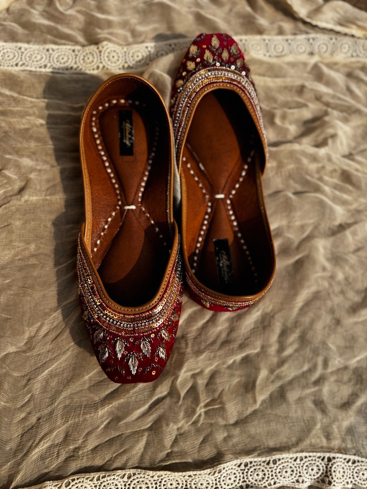 A regal red Punjabi jutti adorned with intricate zari and sequin embroidery, perfect for brides and festive occasions.