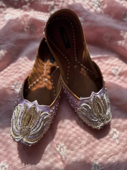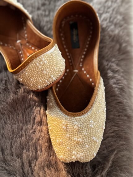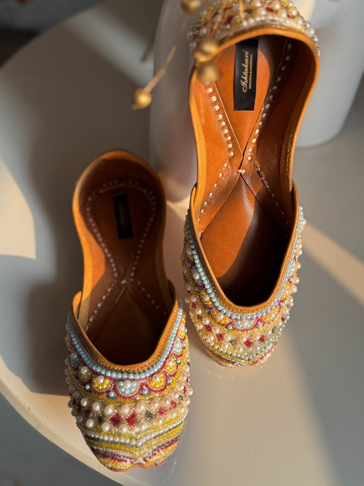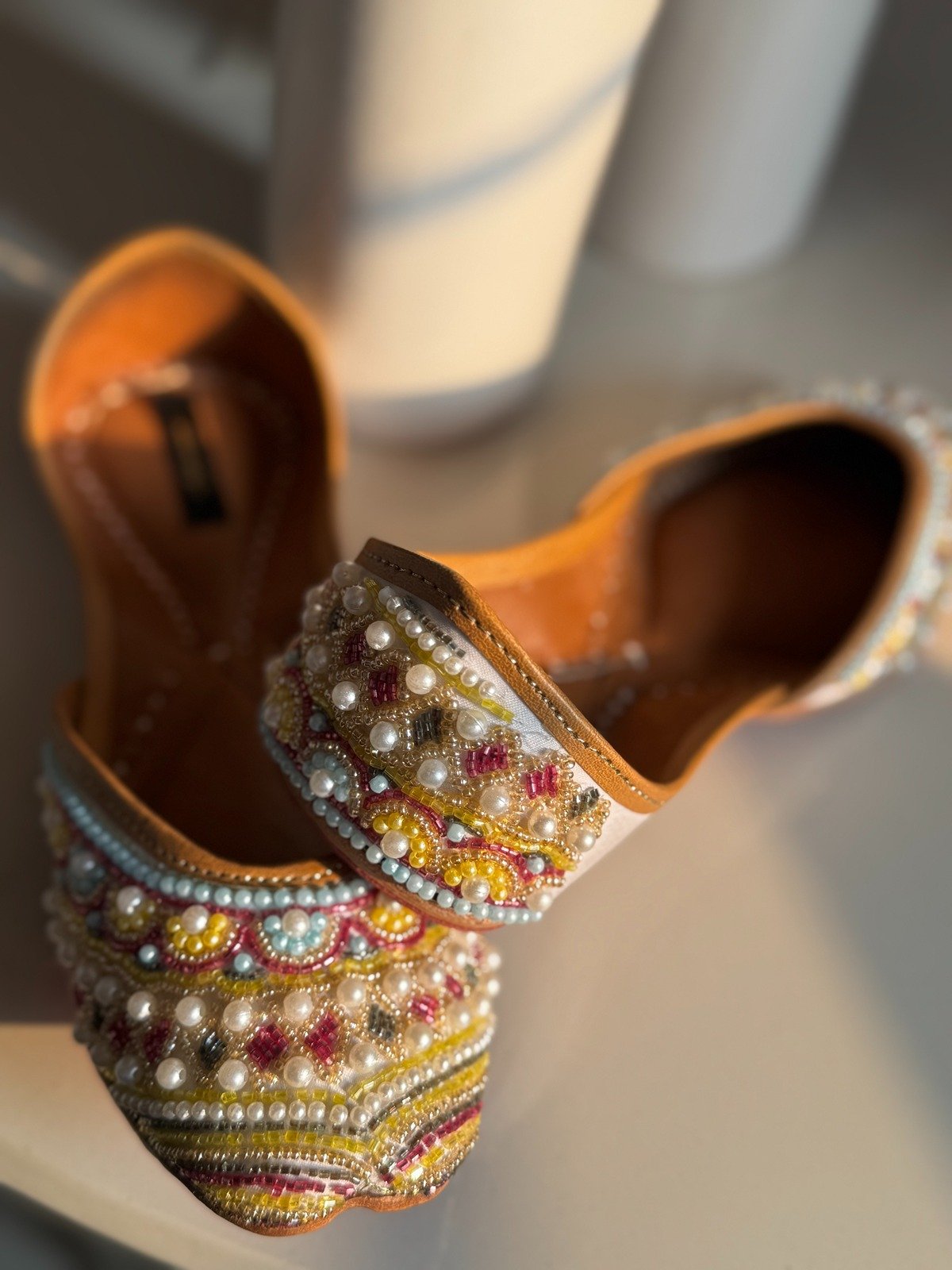 Exquisitely handcrafted jutti adorned with pearls, beads, and pastel threadwork—perfect for weddings and festive celebrations.