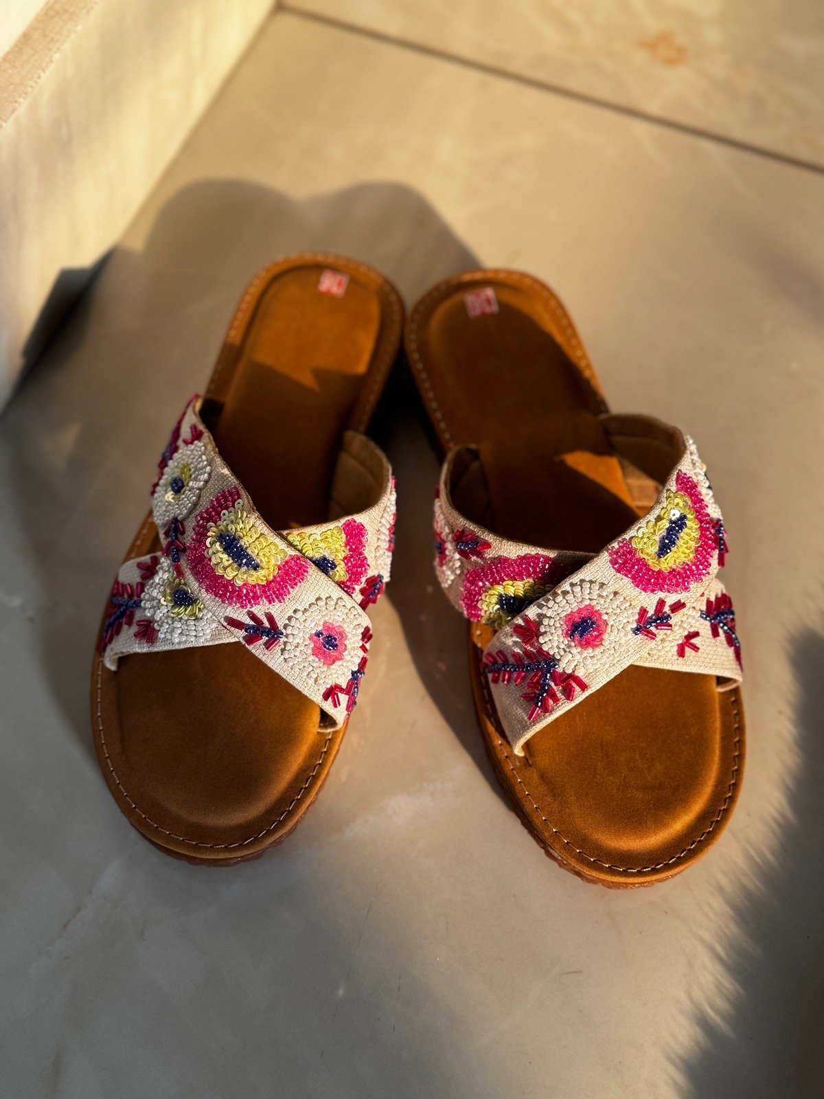 Hand-embroidered comfort sliders with vibrant detailing and doctor sole support for effortless everyday elegance.