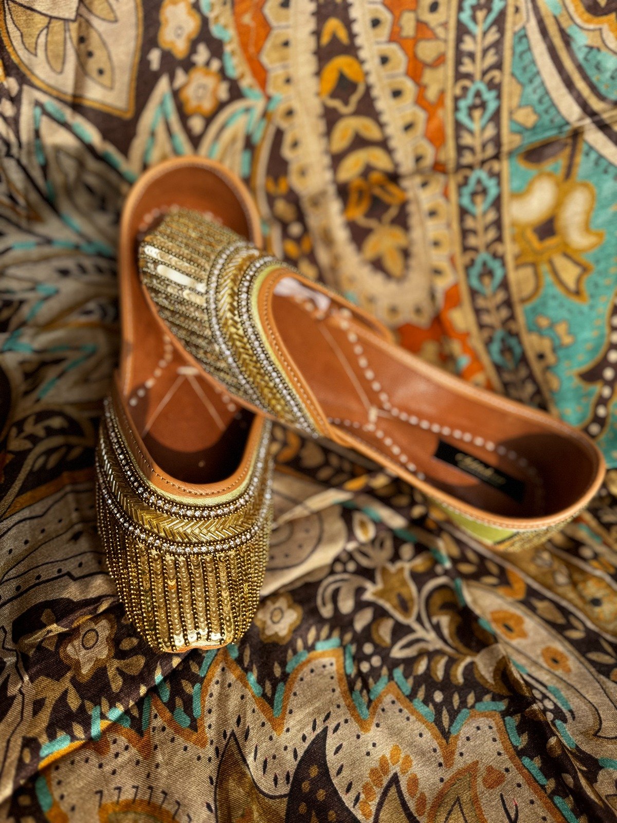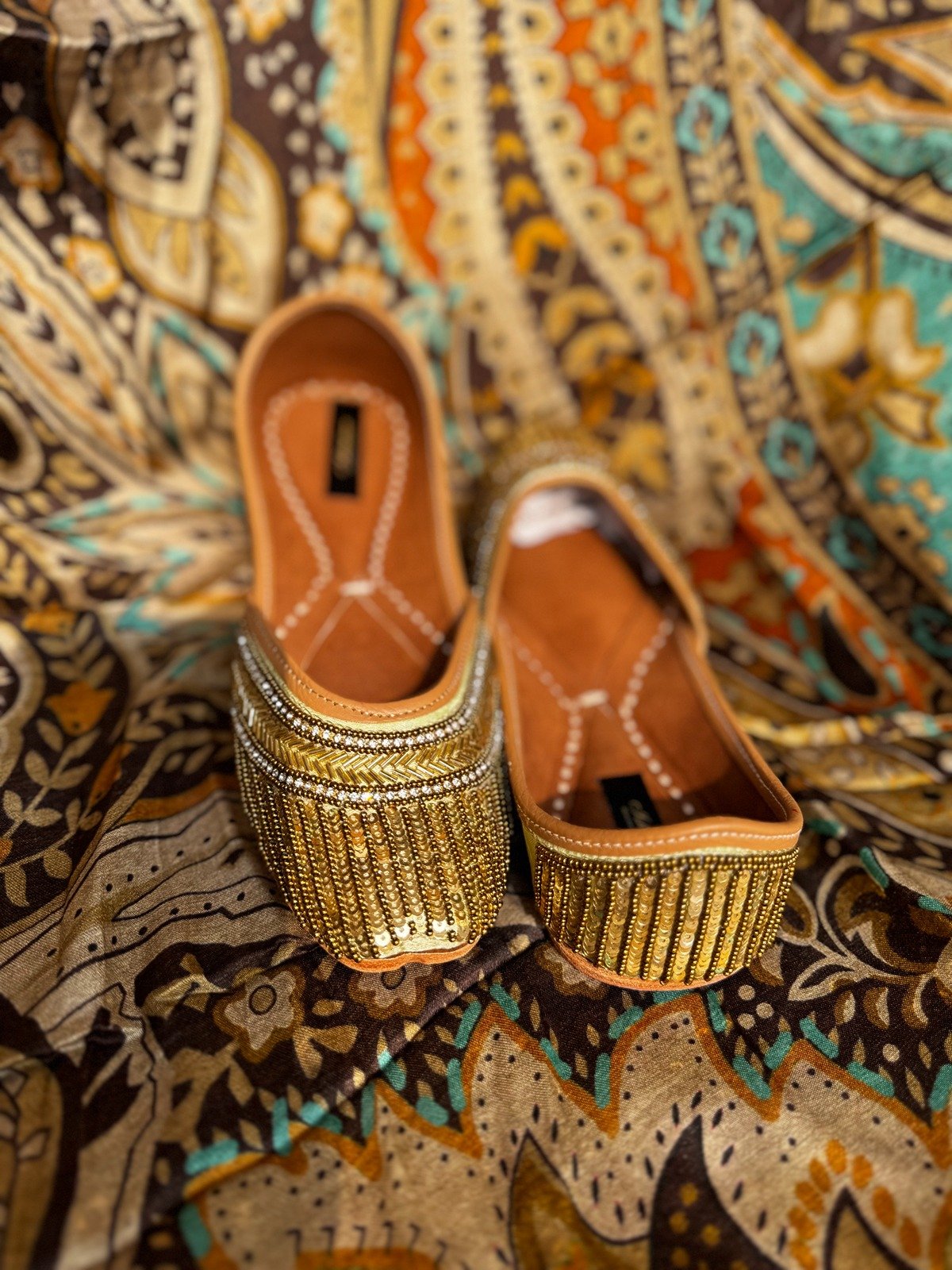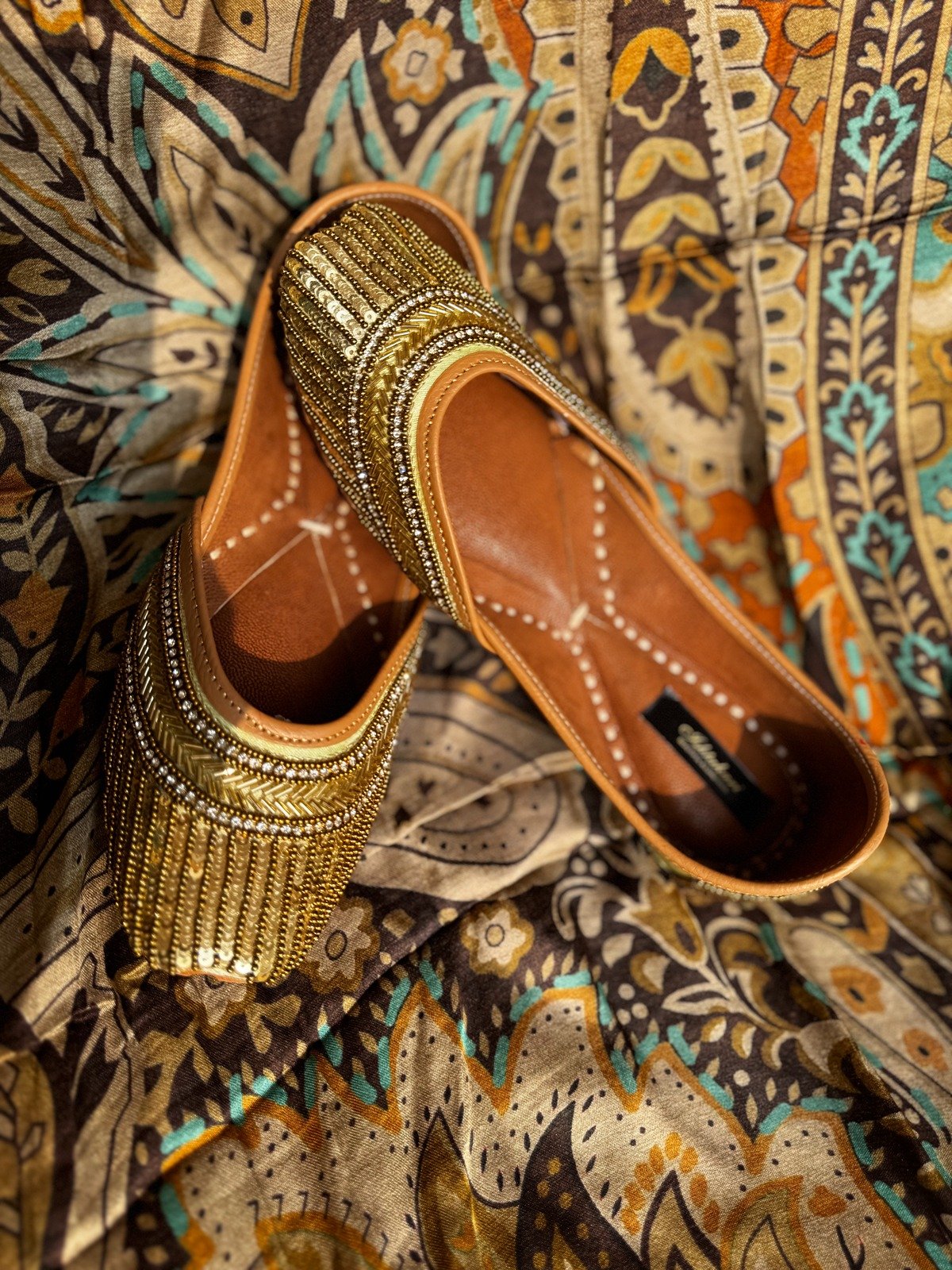 The rich gold embellishments paired with a soft tan lining create a beautiful blend of luxury and comfort. With double cushioning, this jutti ensures ease even during long functions, sangeet nights, mehendi ceremonies, and festive gatherings.